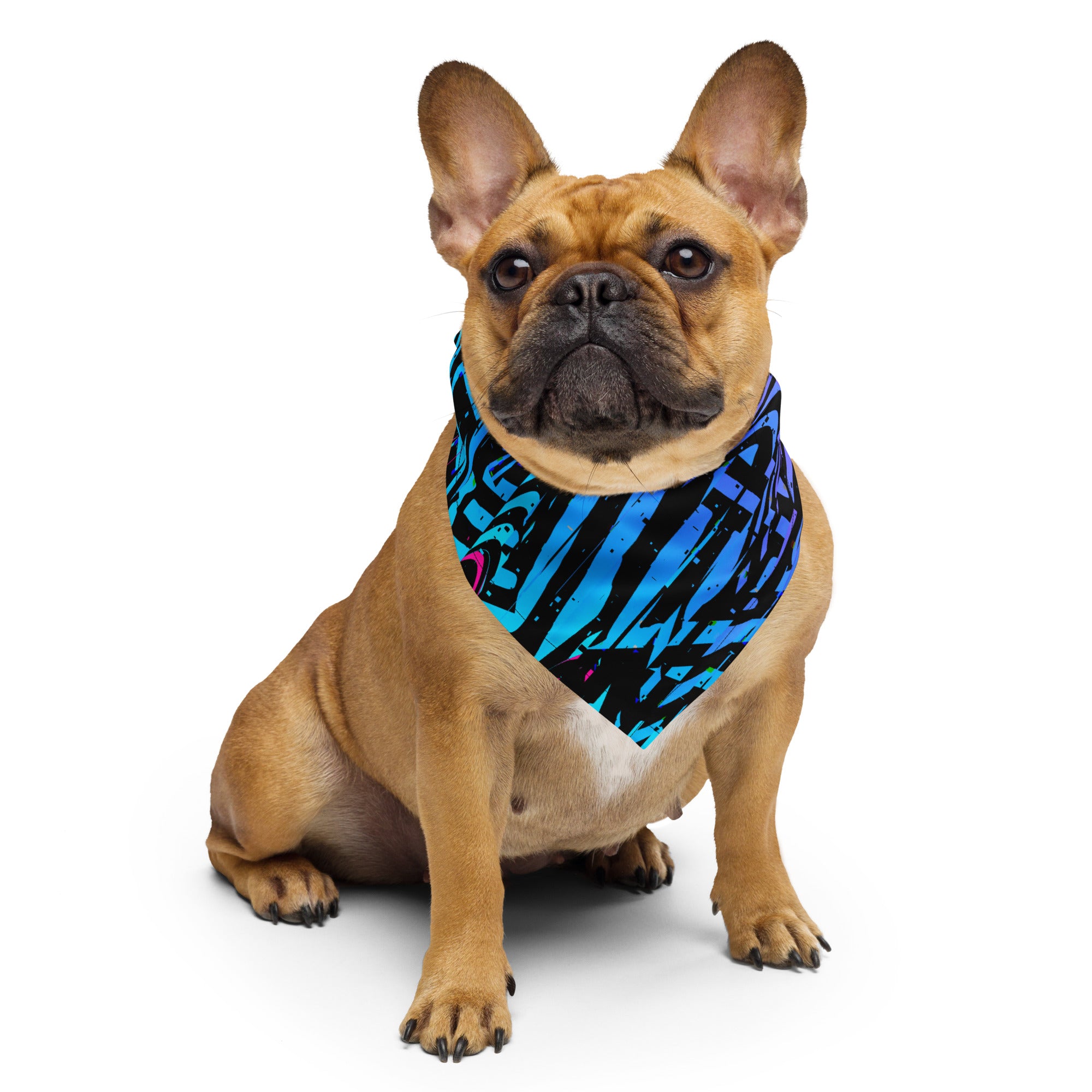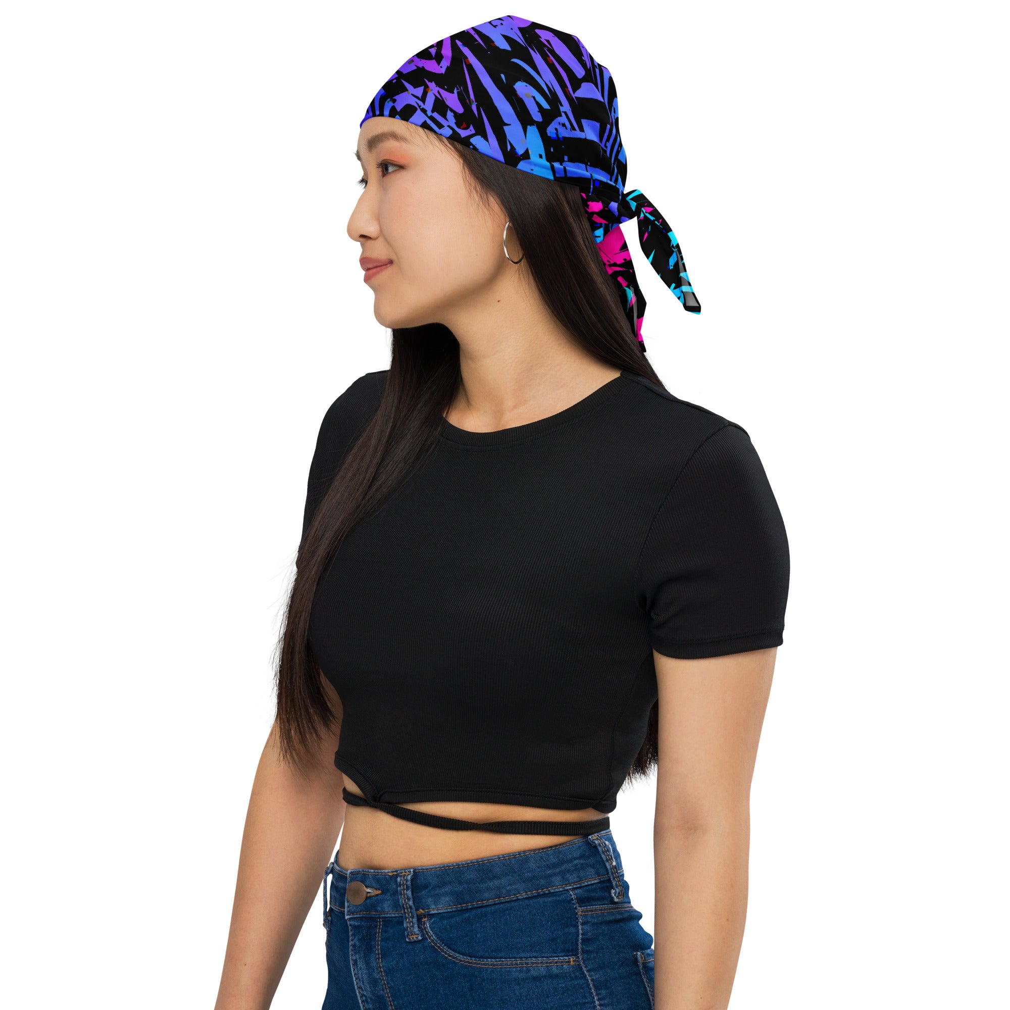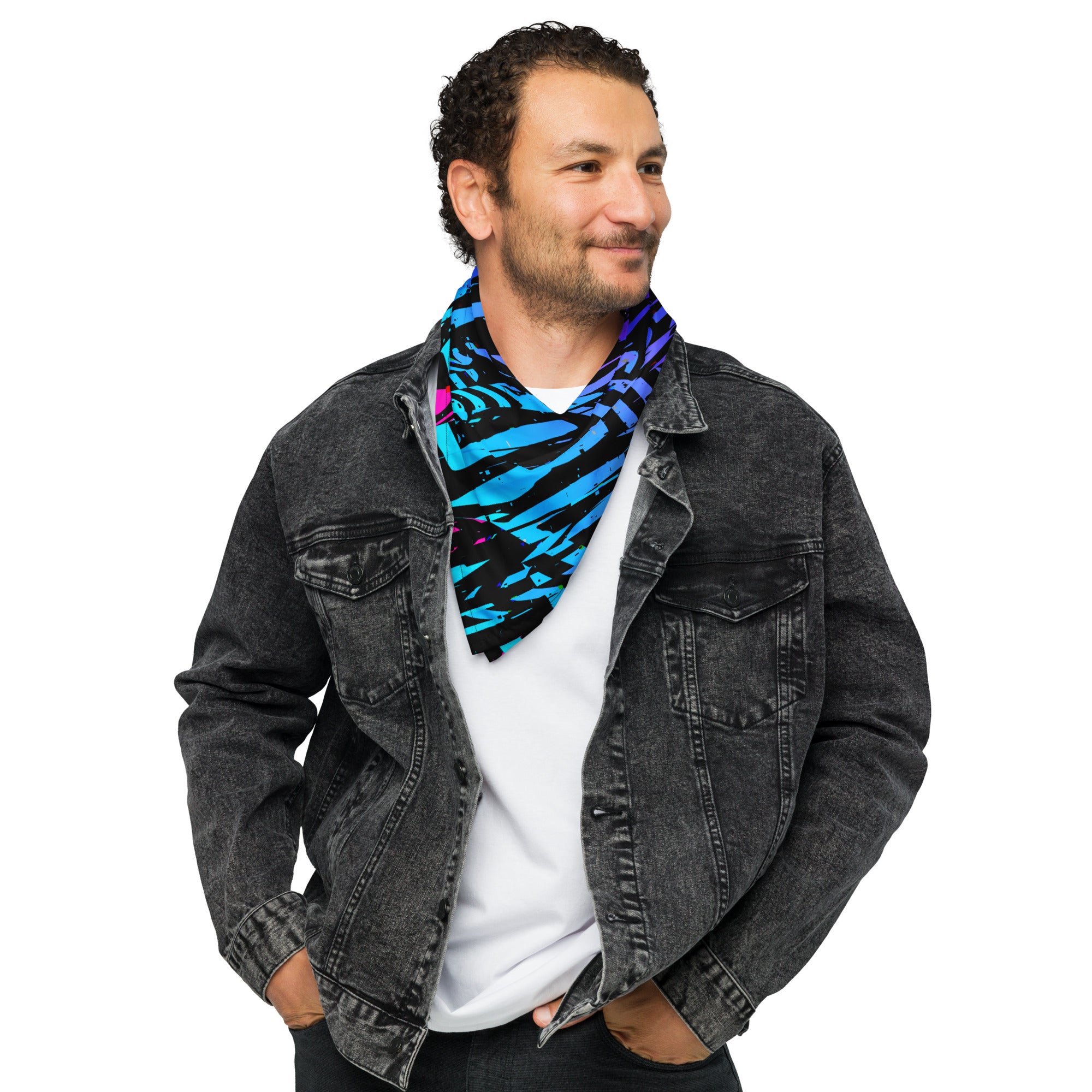 Get ready to make a statement with this blue, purple, pink and black all-over print bandana from BigTexFunkadelic. Mix up your outfits by using this as a headband, necktie, armband, or face covering. Grab a few and head to your next festival in style!
